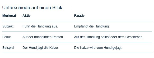 Aktiv und Passiv sind zwei verschiedene Verbformen, die den Fokus eines Satzes verschieben: Im Aktiv führt das Subjekt die Handlung aus, während im Passiv das Subjekt die Handlung empfängt und der Fokus auf dem Geschehen selbst liegt. Das Passiv wird mit dem Hilfsverb „werden" und dem Partizip II des Vollverbs gebildet.