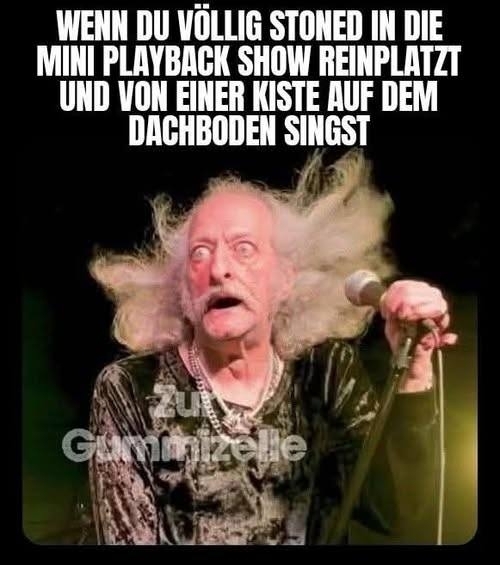 IN DIE MINI PLAYBACK SHOW REINPLATZT UND VON EINER KIST AUF DEM DACHBODEN SINGST
