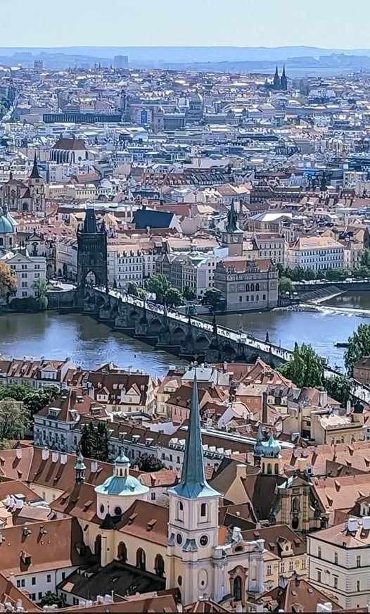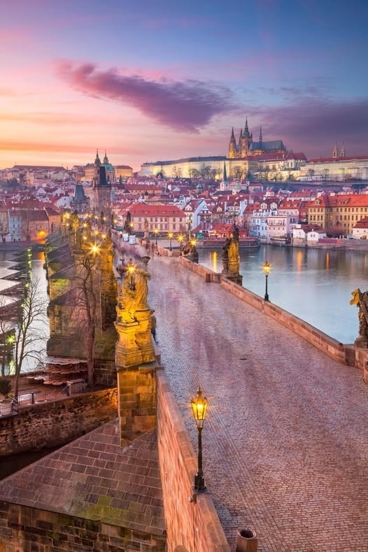 Prague, Czech Republic. Aerial cityscape image of Prague with famous Charles Bridge and Prague Castle during beautiful sunset.
