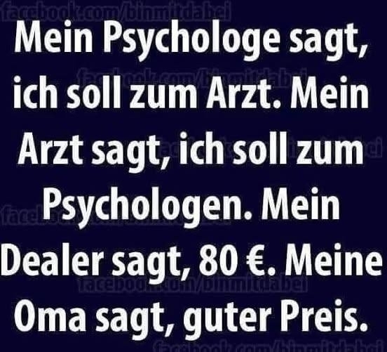Mein Arzt sagt, ich soll zum Psychologen. Mein Dealer sagt, 80 €. Meine Oma sagt, guter Preis.