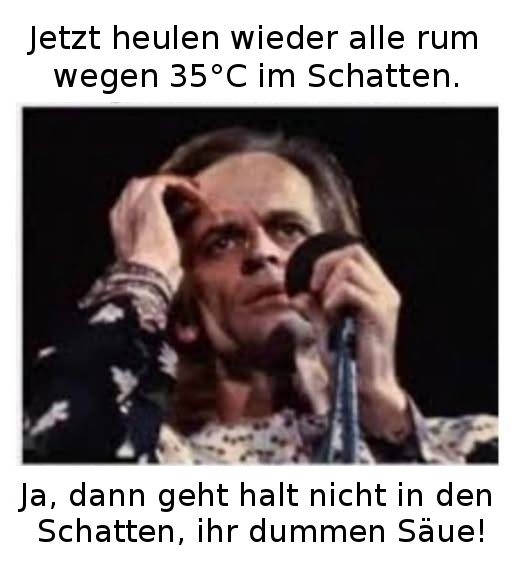 ..wegen 35°C im Schatten. - Ja, dann geht halt nicht in den Schatten, ihr dummen Säue!