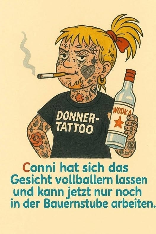 Conni hat sich das Gesicht vollballern lassen und kann jetzt nur noch in der Bauernstube arbeiten.